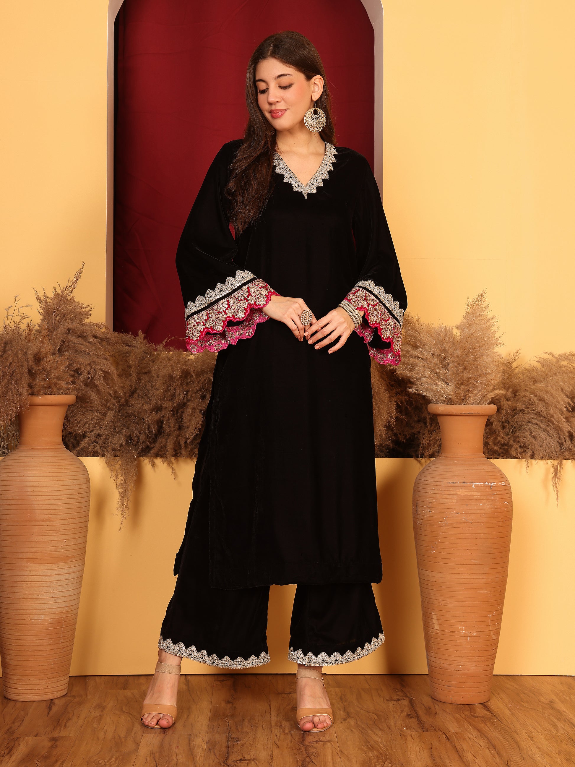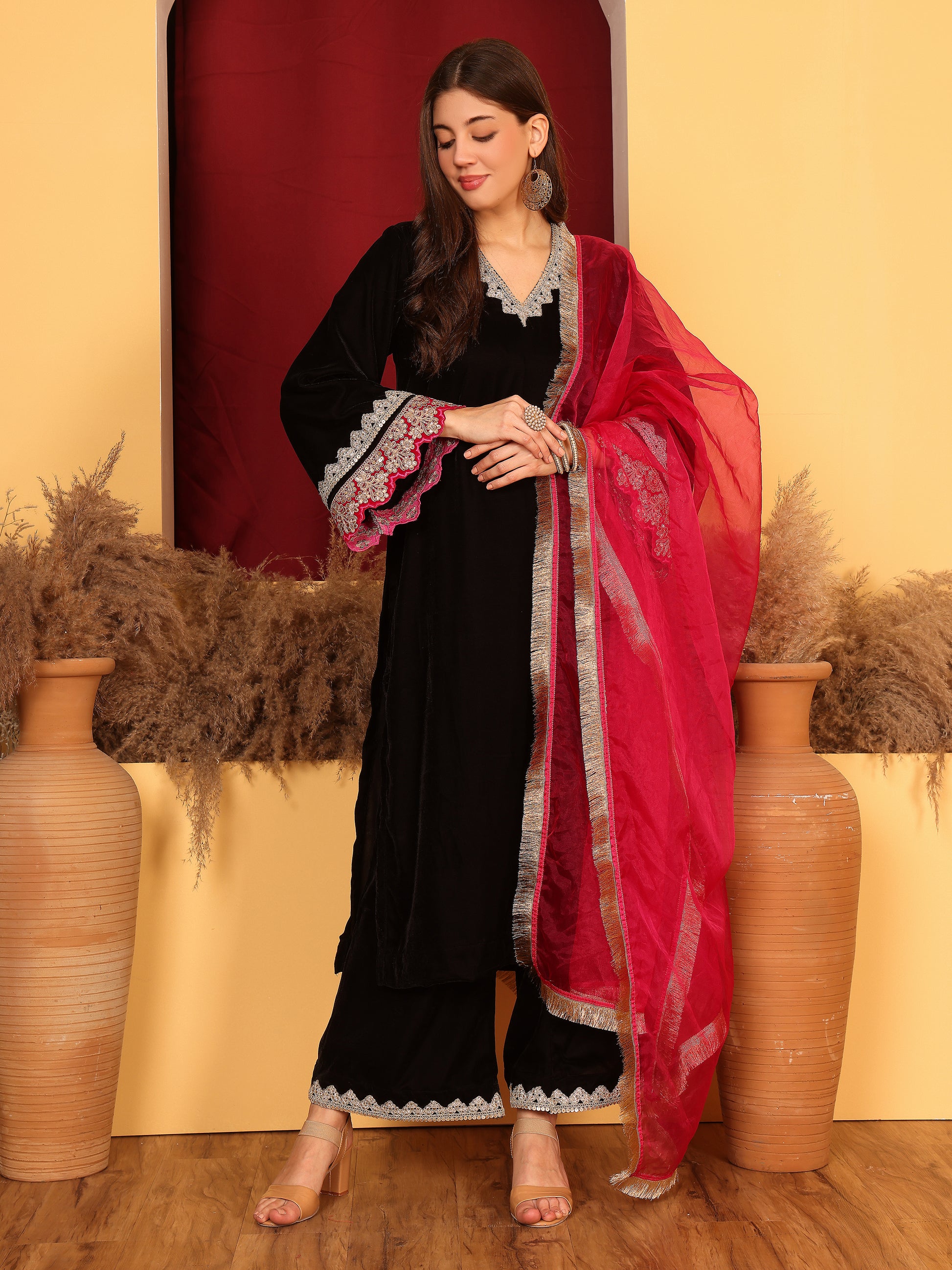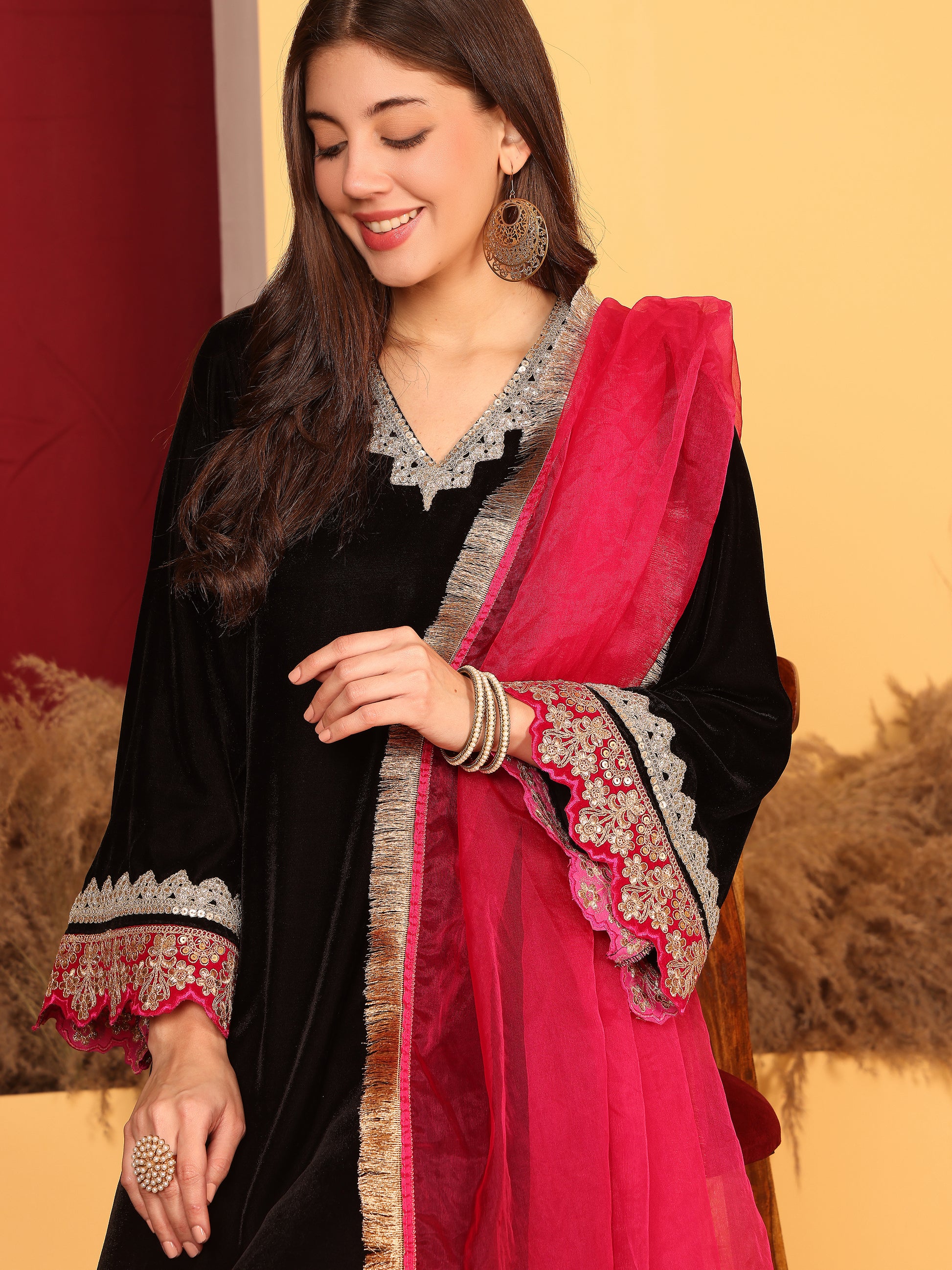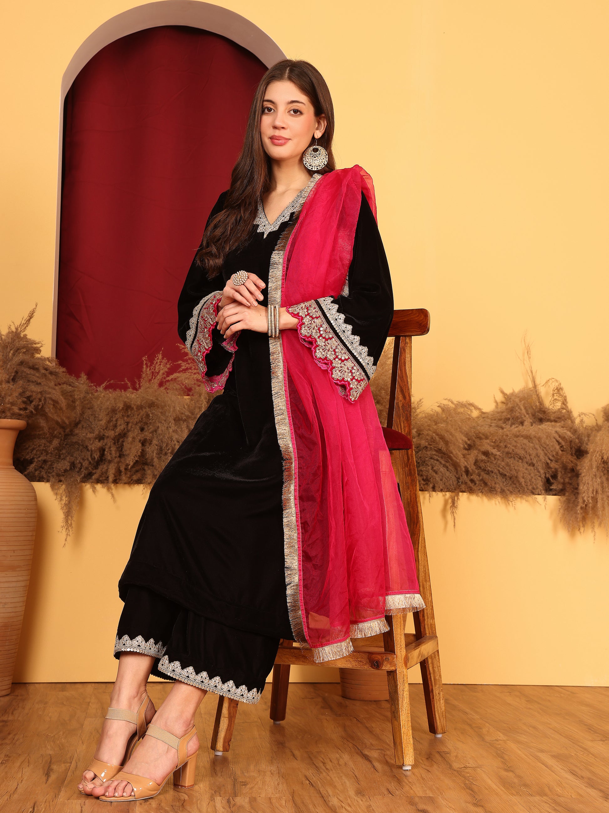 A combination of Black and pink. This velvet suit is vibrant yet chique. The golden lace detailing and frilled dupatta ads to the charm. A must have piece for a winter evening function!