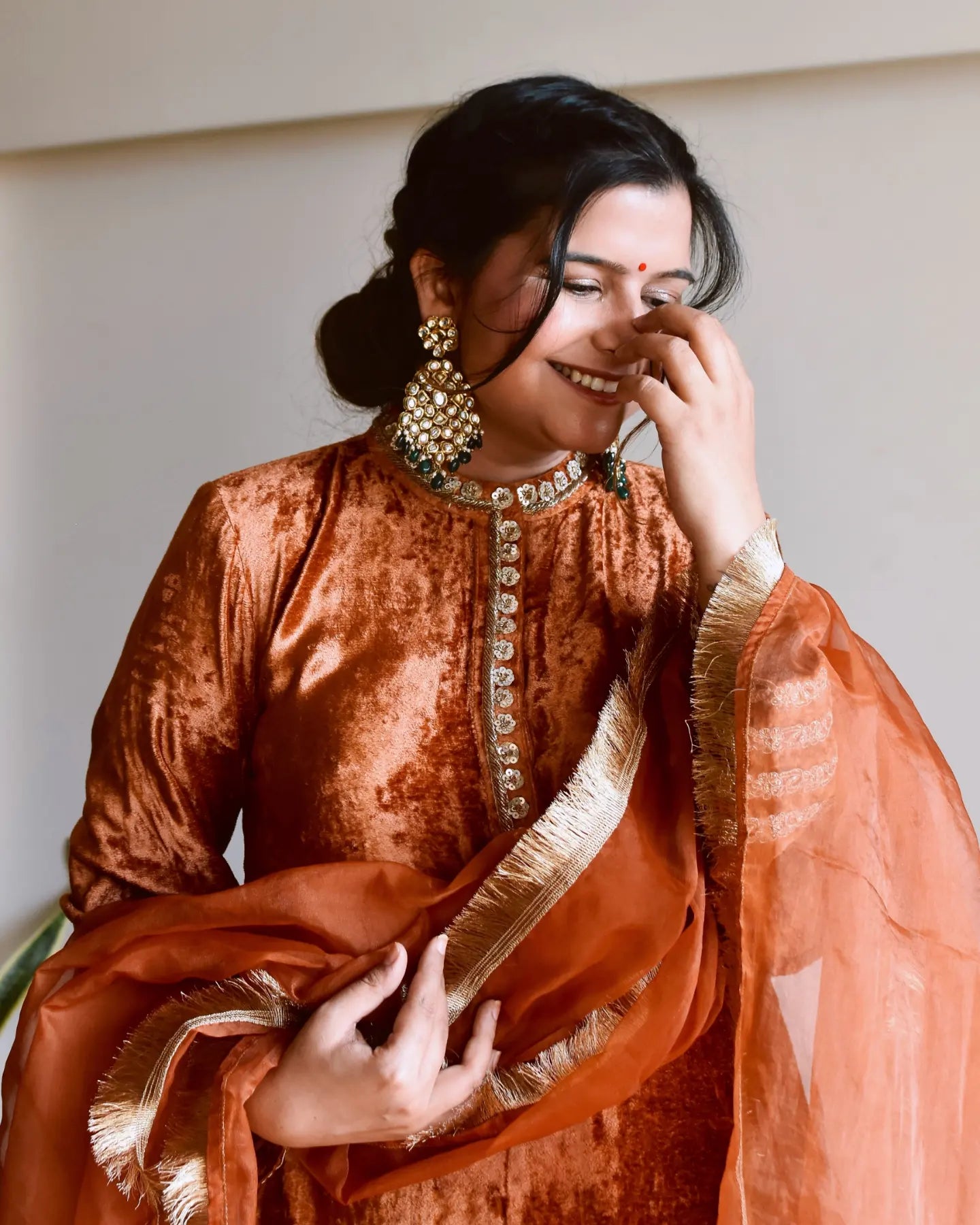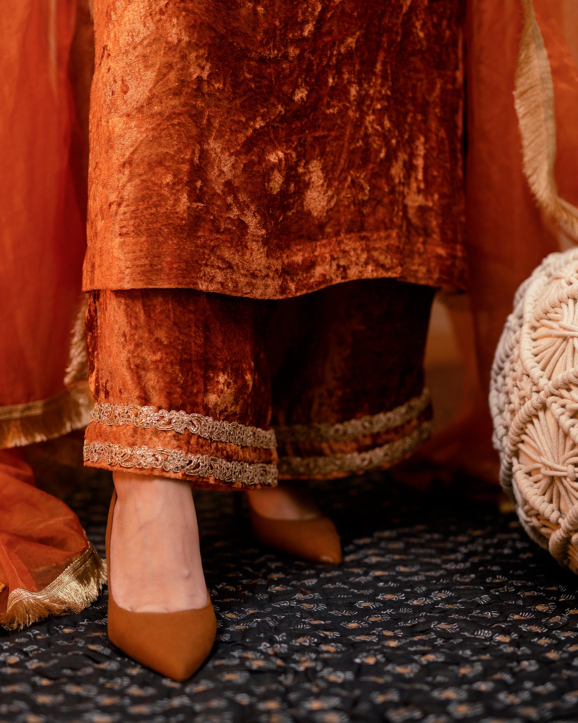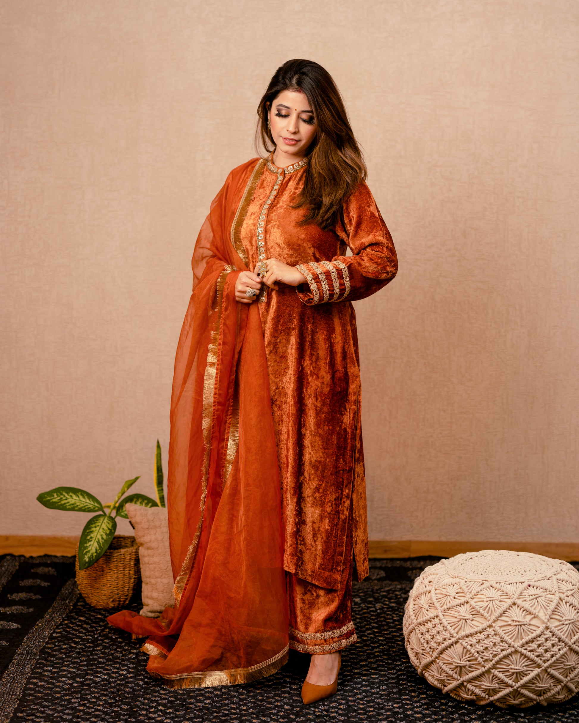 This Orange velvet suit stands out and make you shine like a moon. Meher is made keeping in mind the simplicity and detailing which makes it presence felt without being too loud!