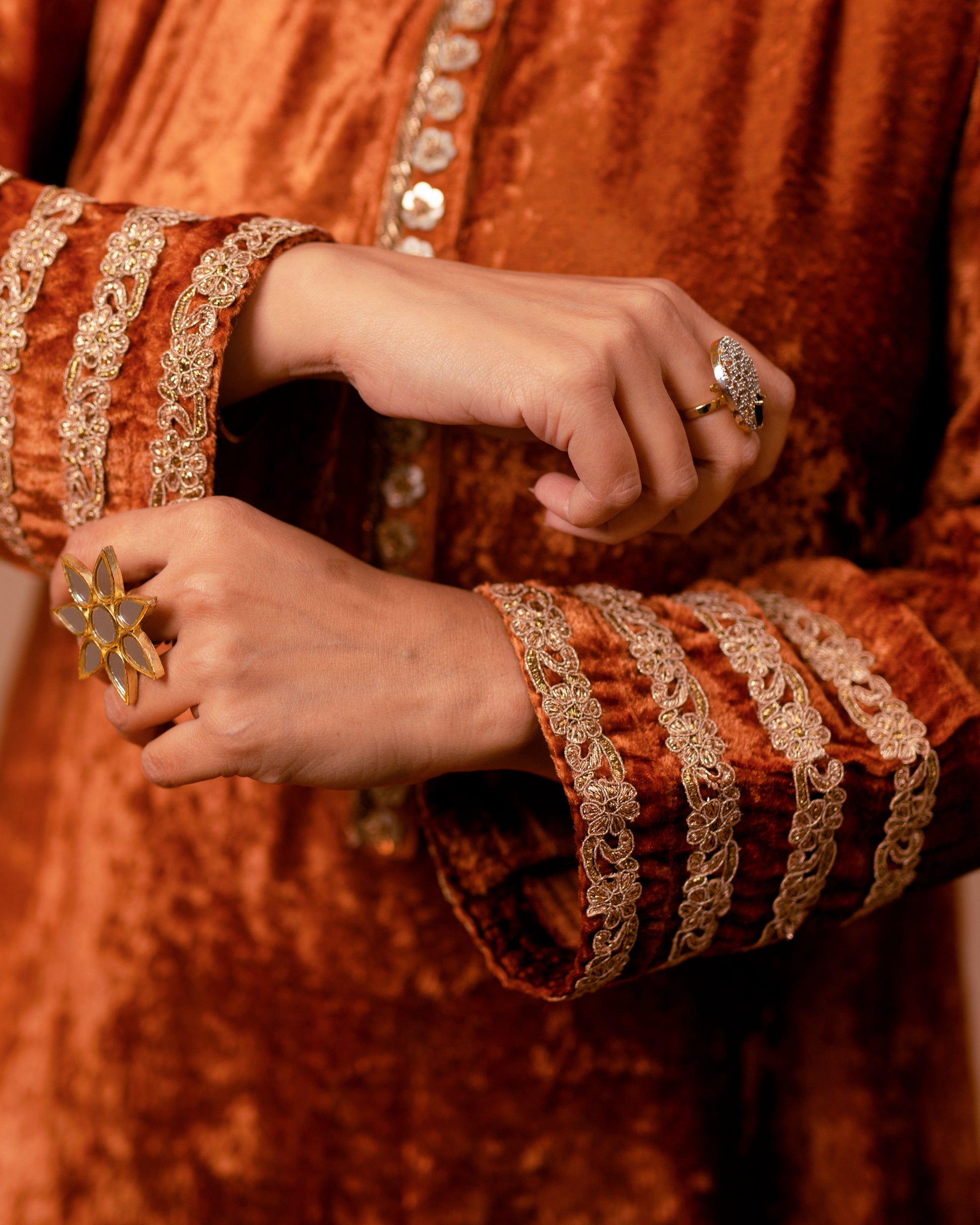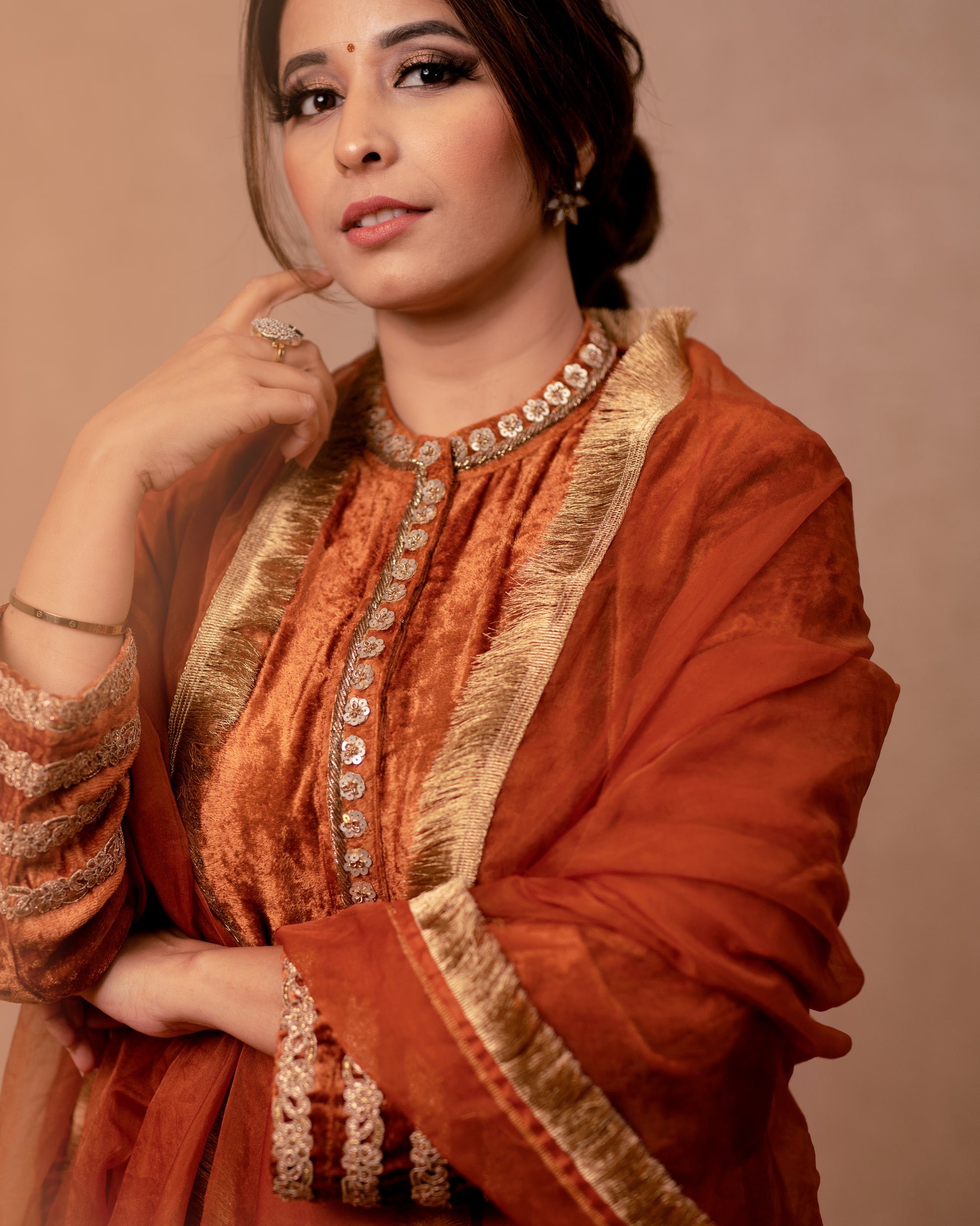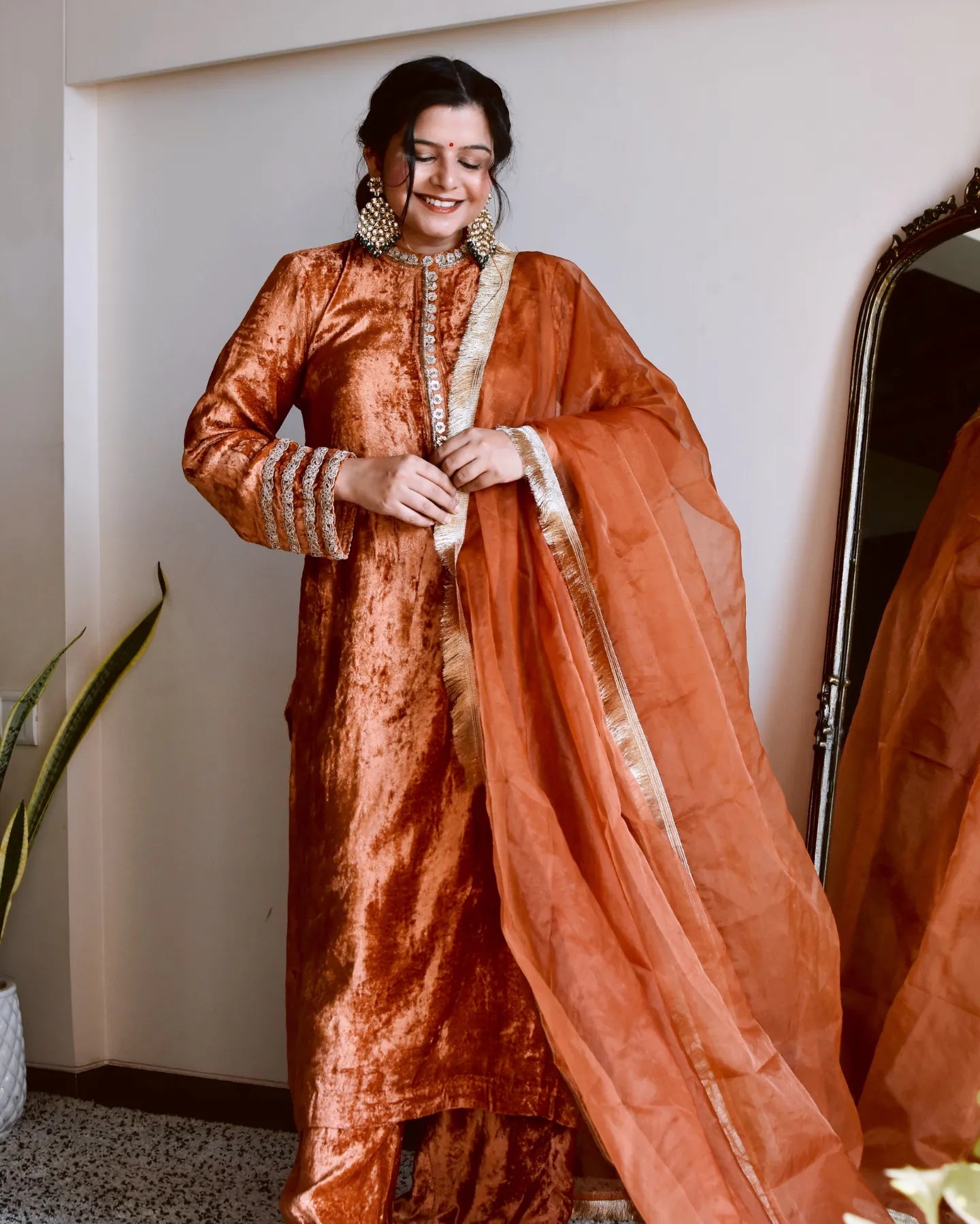 This Orange velvet suit stands out and make you shine like a moon. Meher is made keeping in mind the simplicity and detailing which makes it presence felt without being too loud!