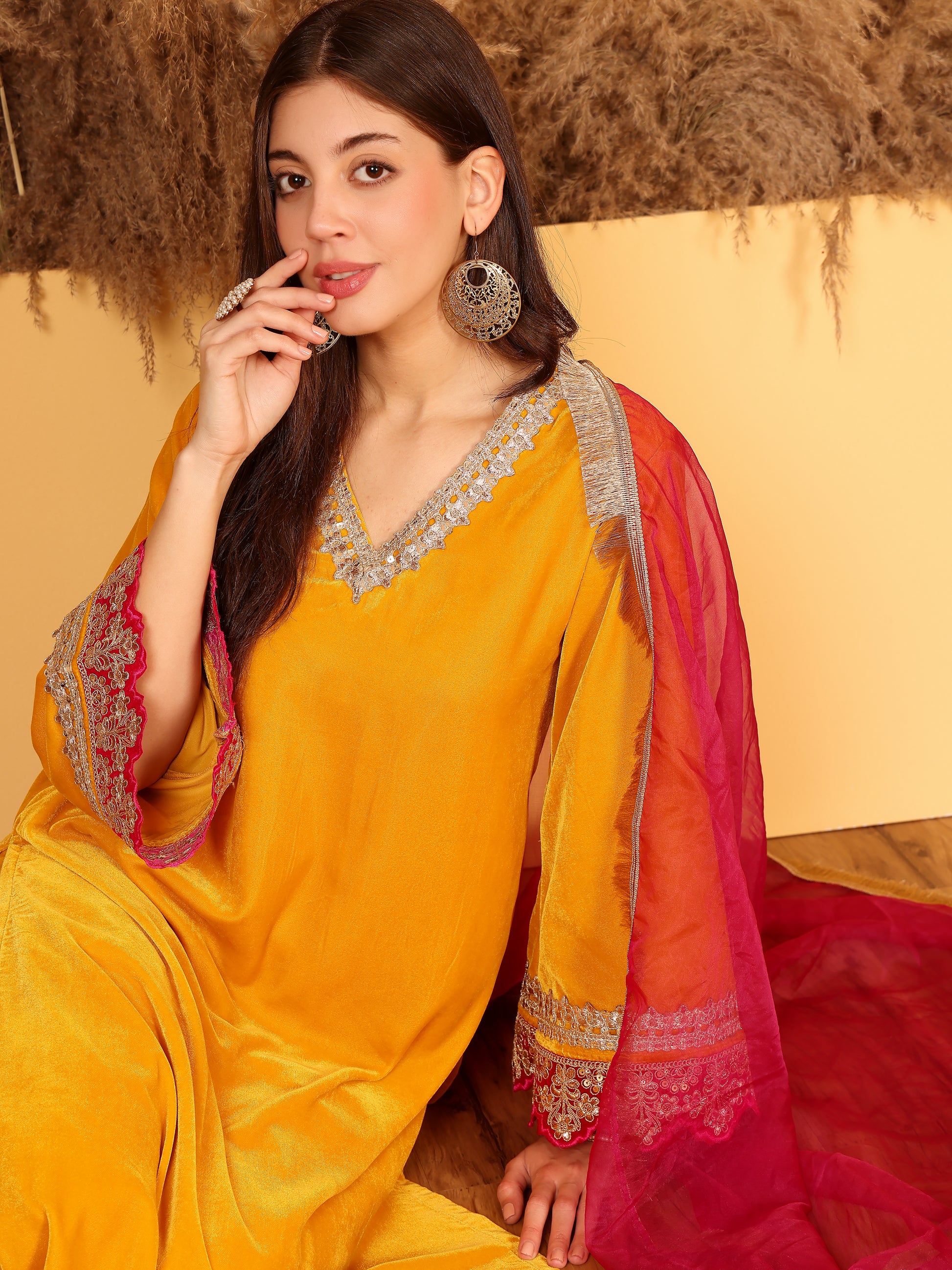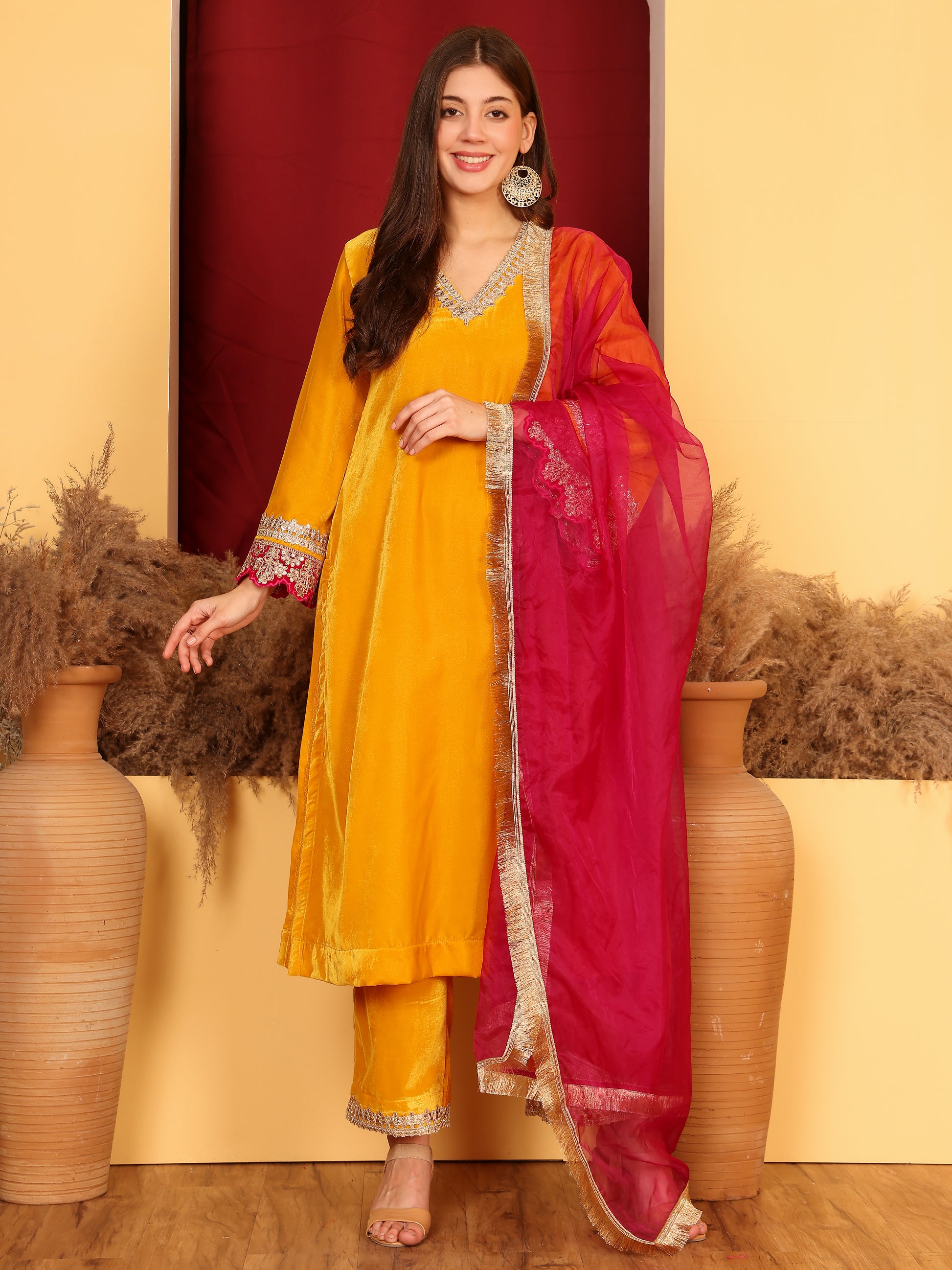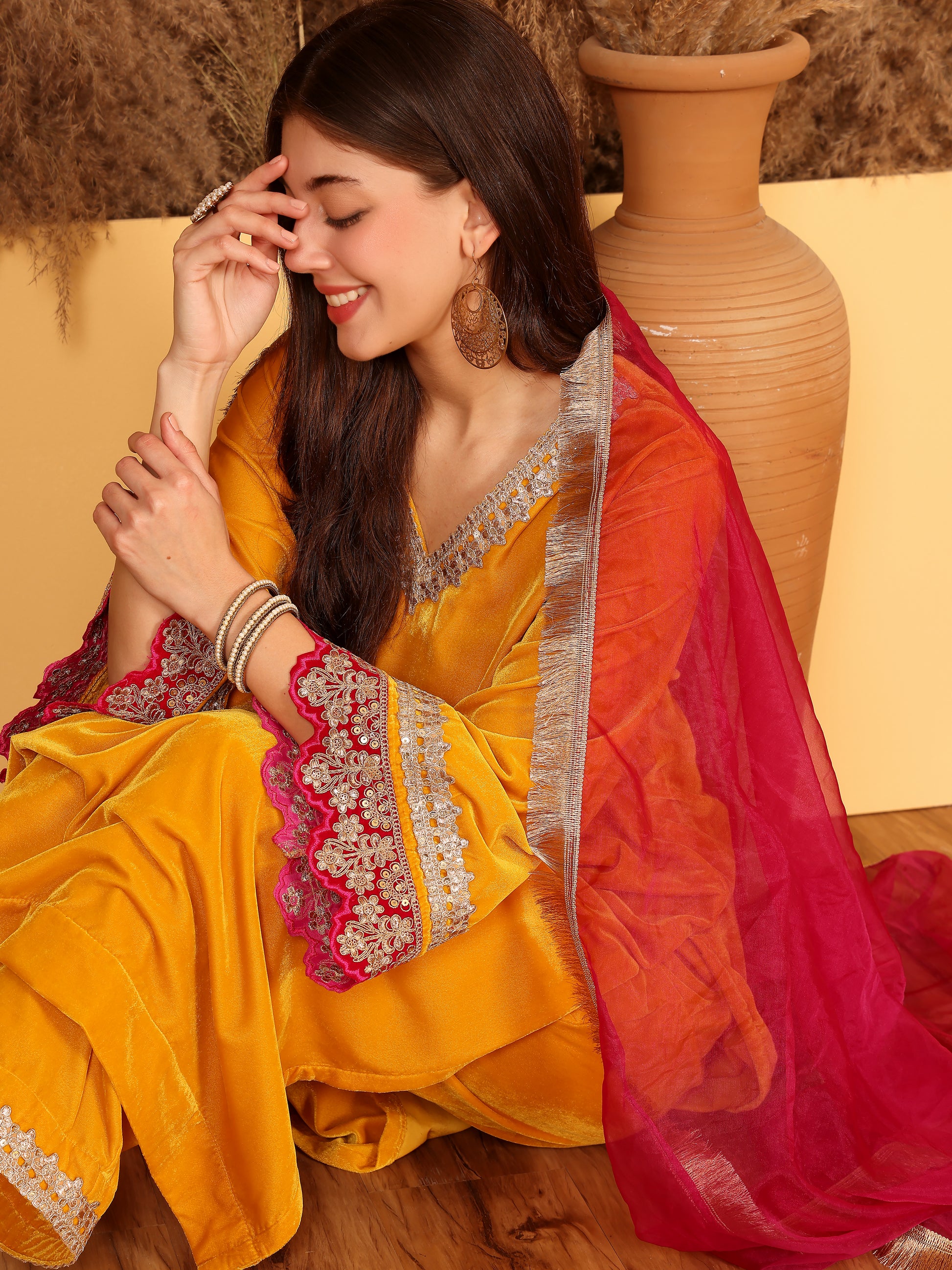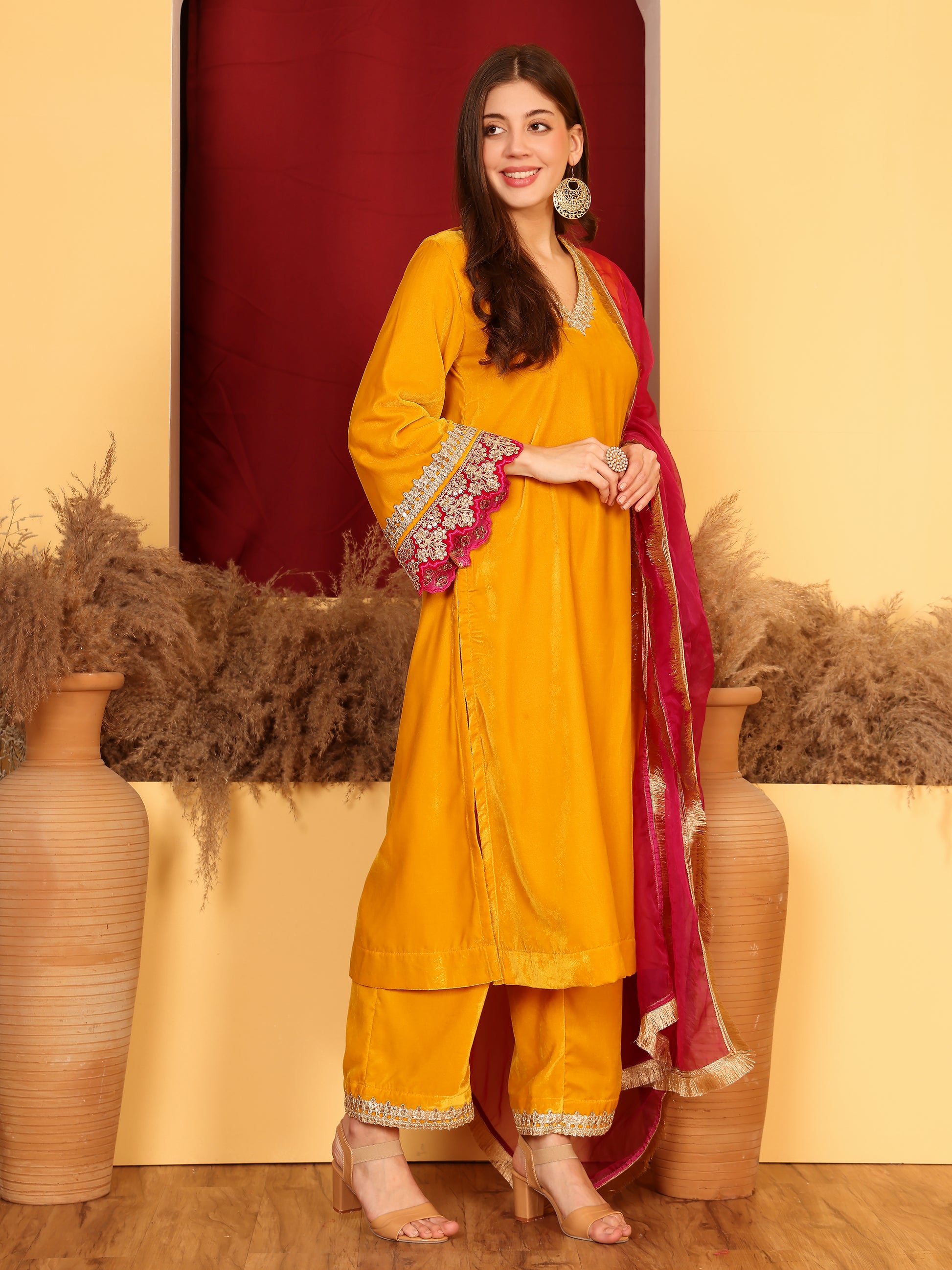 A perfect velvet suit for haldi function and winter weddings. This mustard yellow velvet suit is accentuated with contrast pink lace detailing and is paired with contrast pink dupatta.