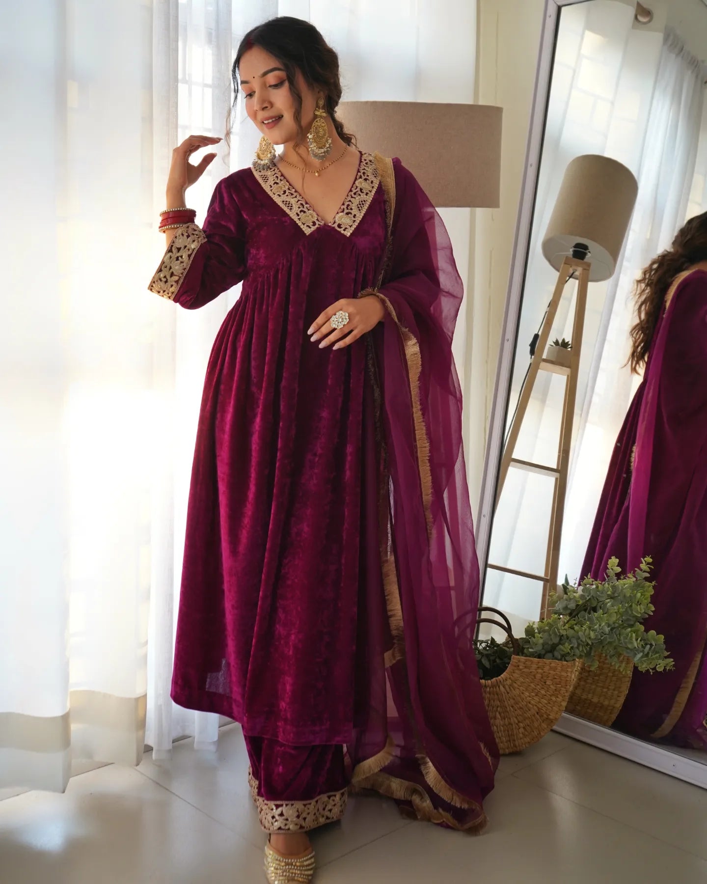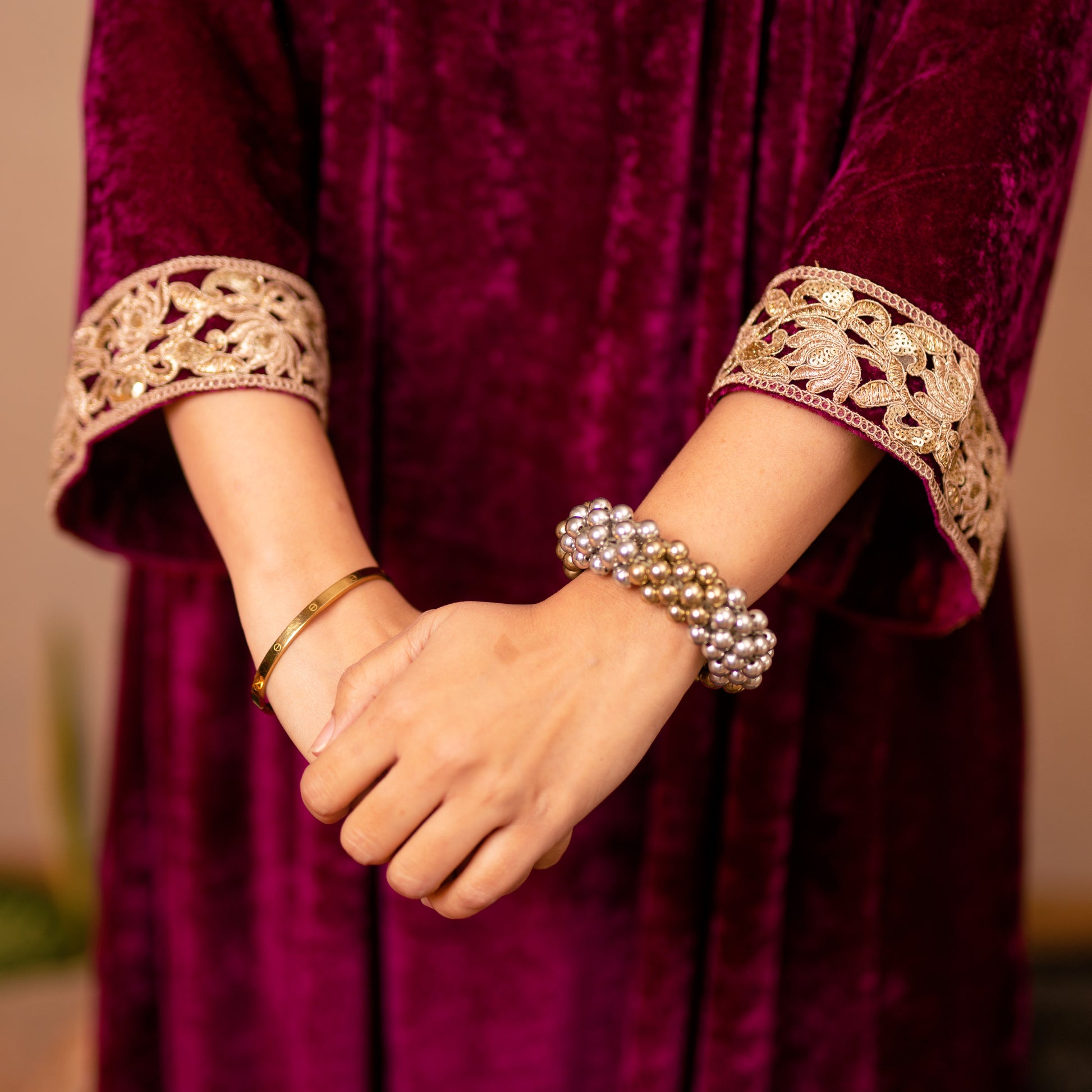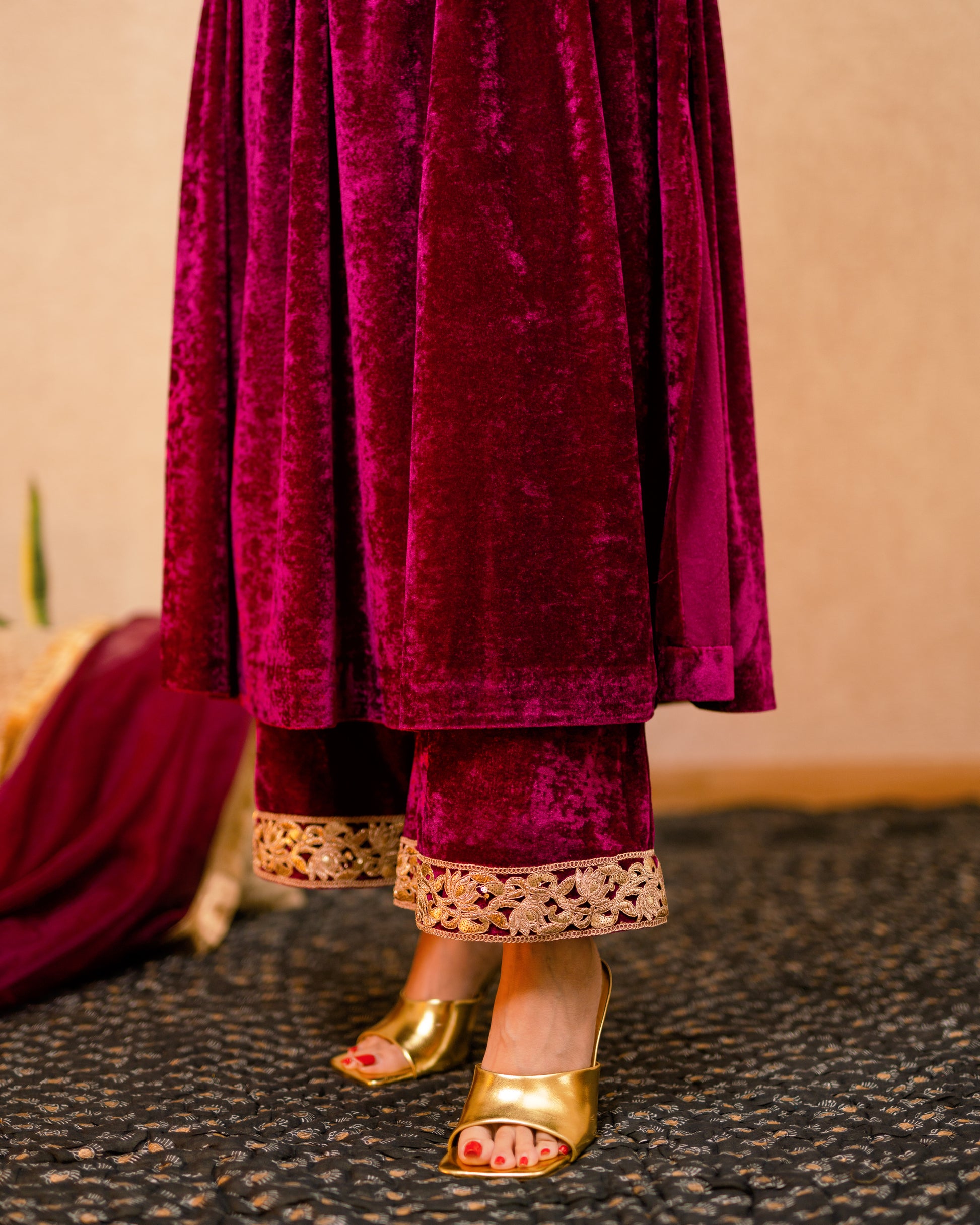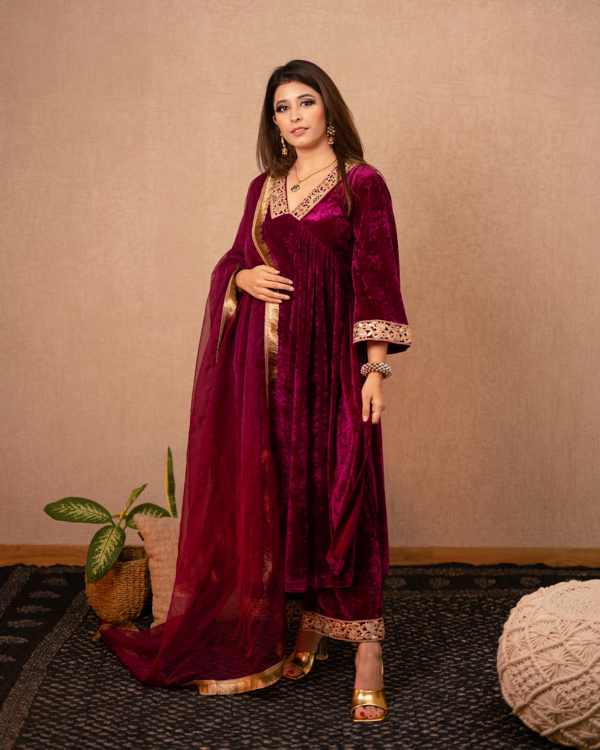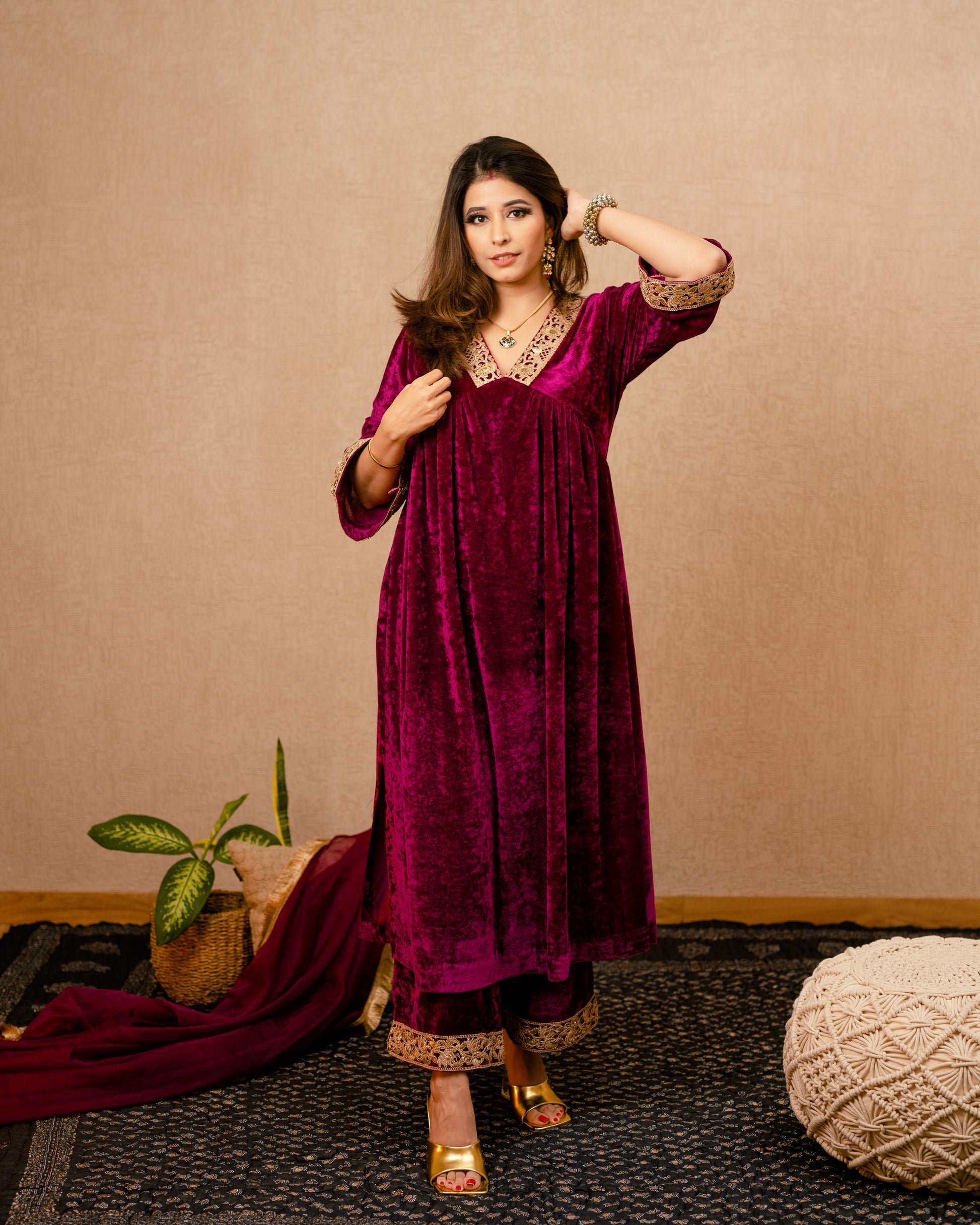 This velvet suit stands out and make you shine like a moon. Roma is made keeping in mind the simplicity and detailing which makes it presence felt without being too loud!