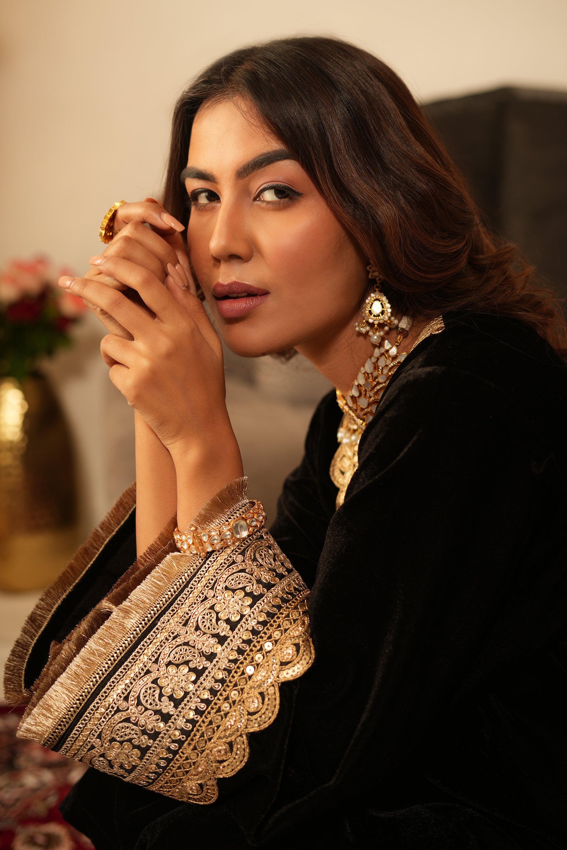 This Black velvet suit stands out and make you shine like a moon. NIRJAH is made keeping in mind the simplicity and detailing which makes it presence felt without being too loud!
