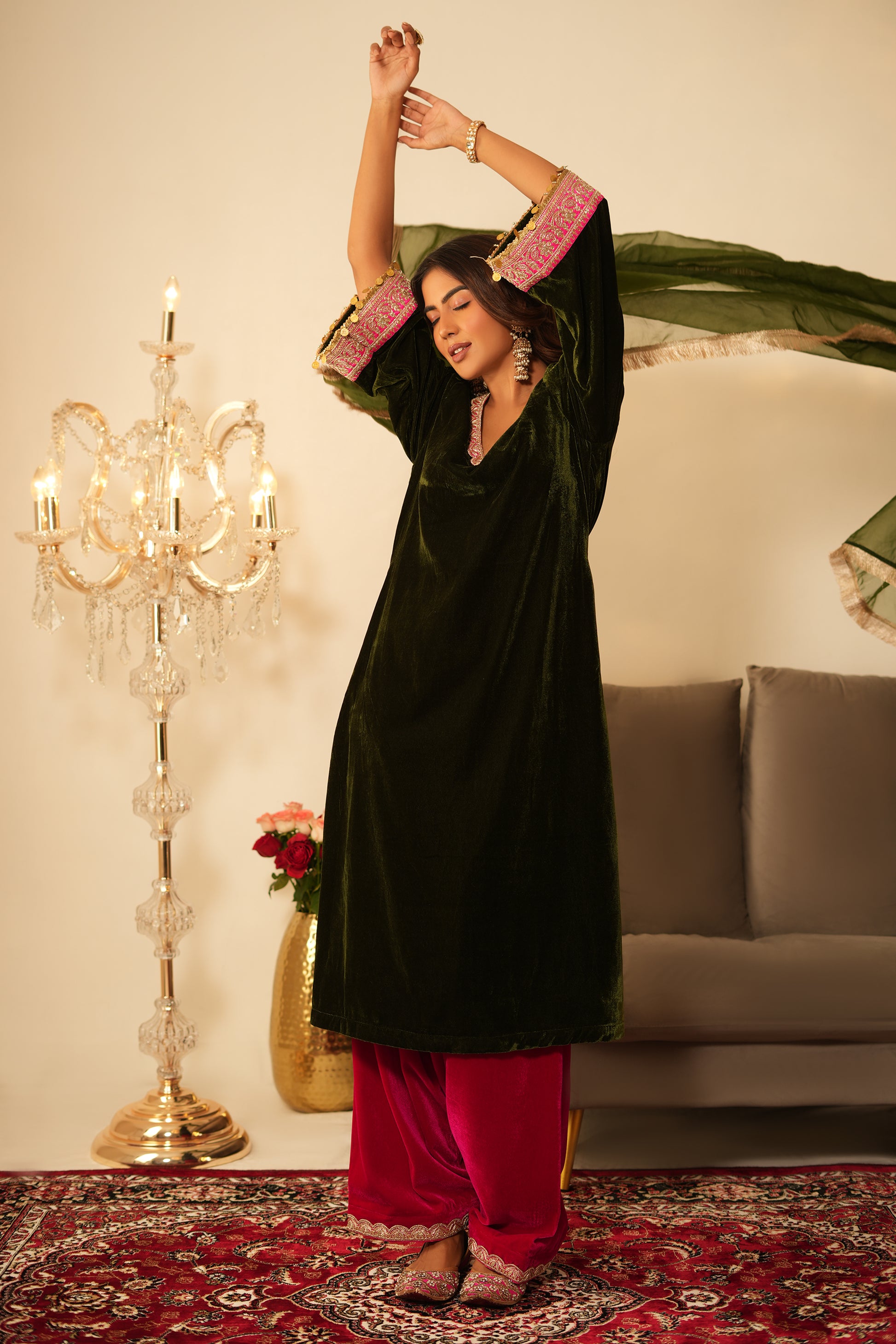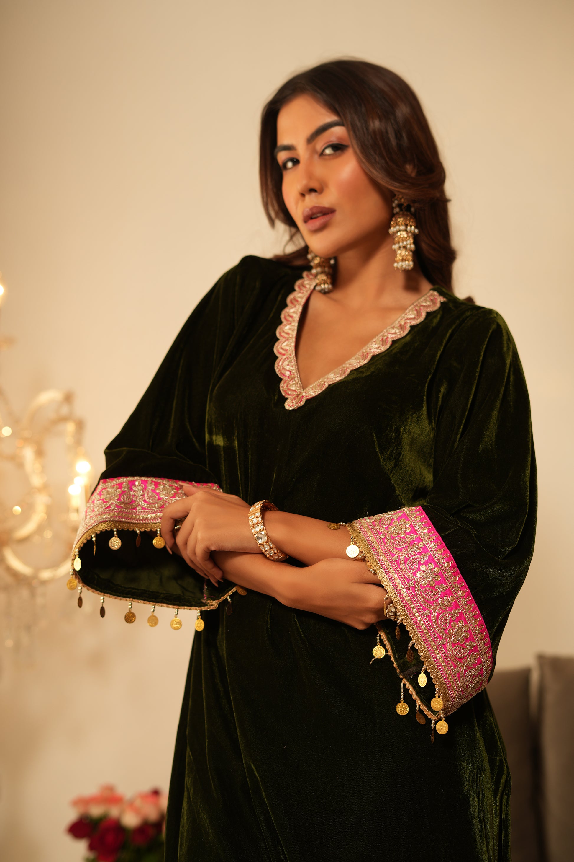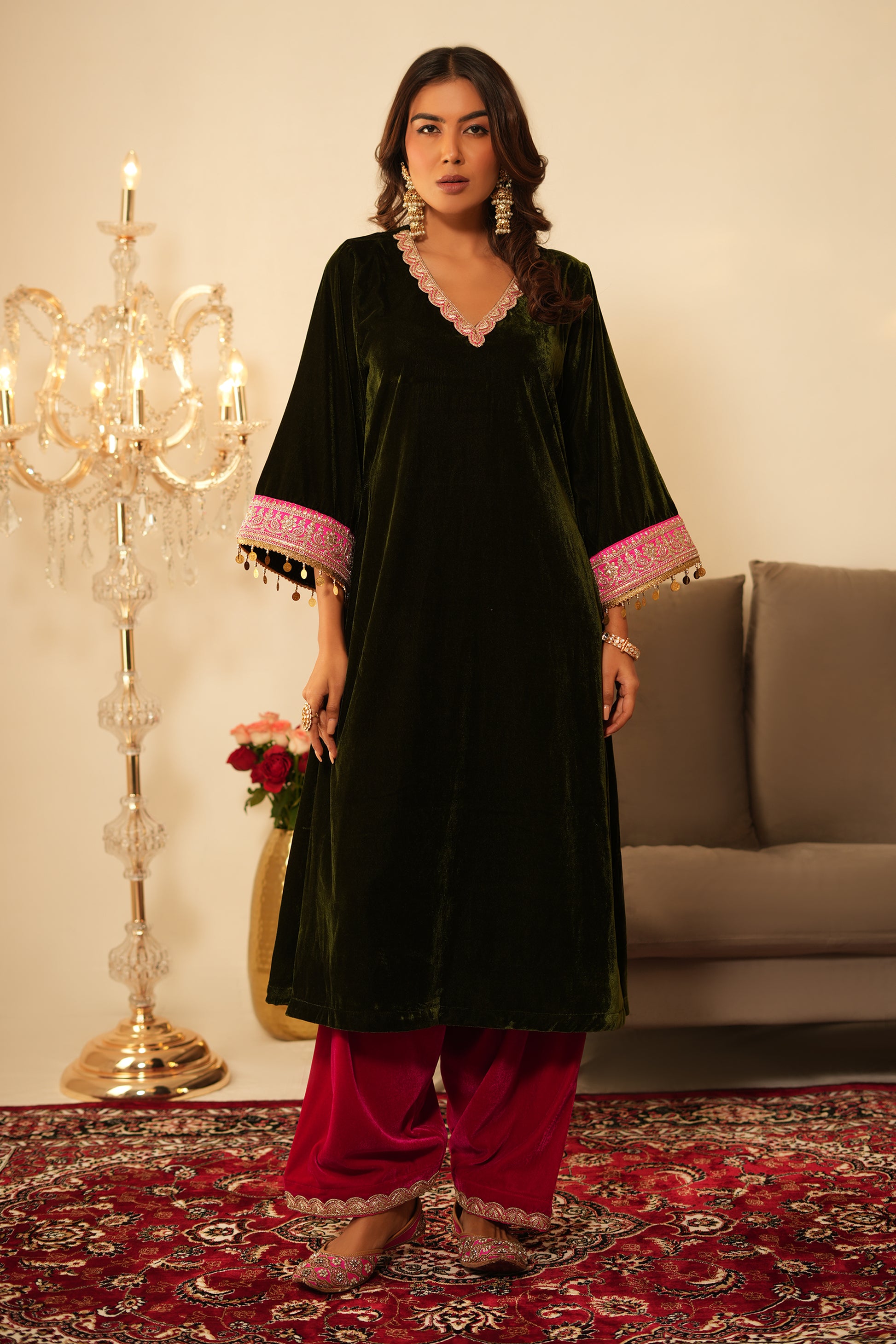 A MEHENDI Green Velvet Suit set with contrast lace detailing on sleeves and bottom. A very smart and trendy style perfect for all winter parties and weddings. It comes with organza green dupatta.