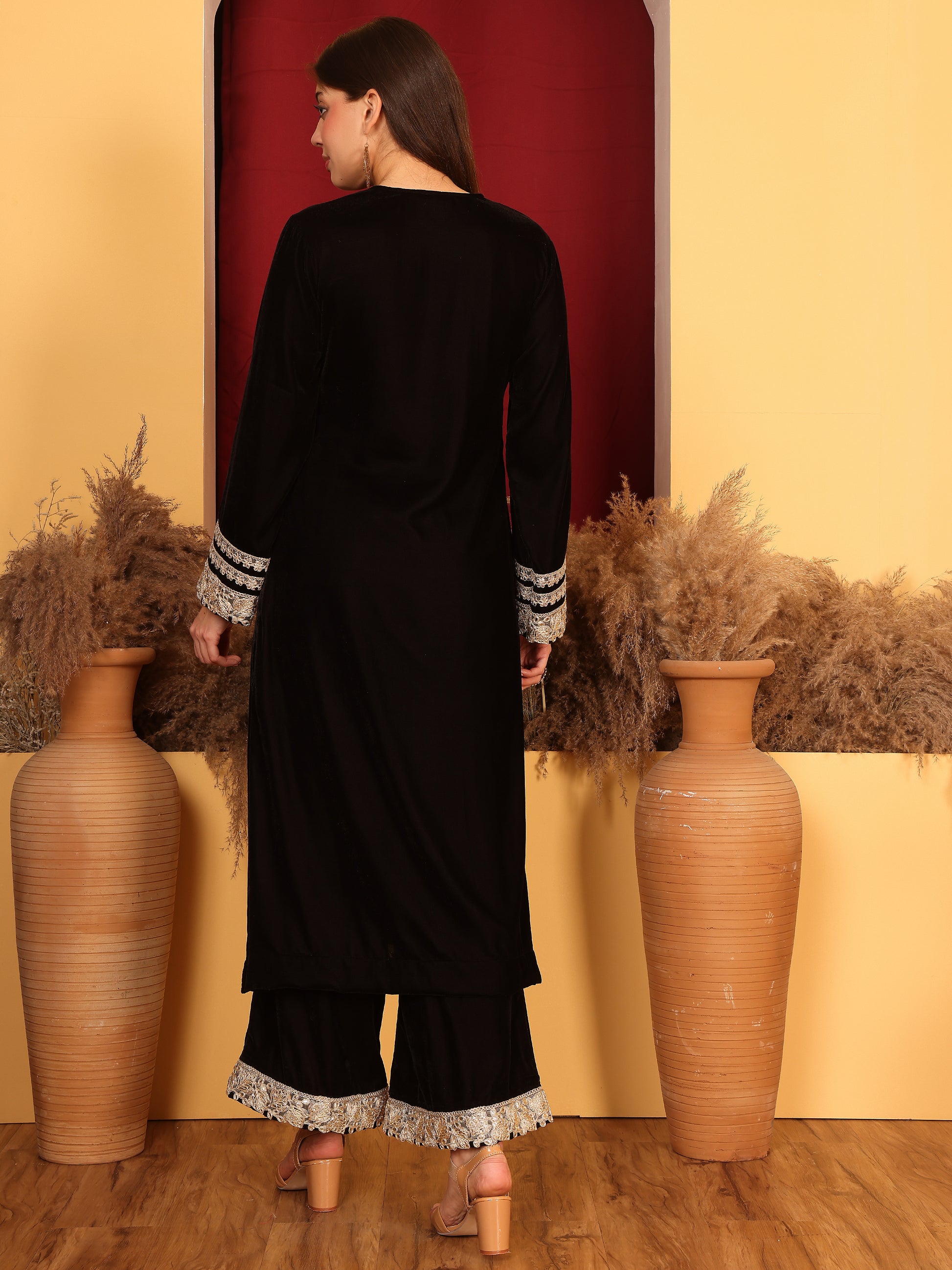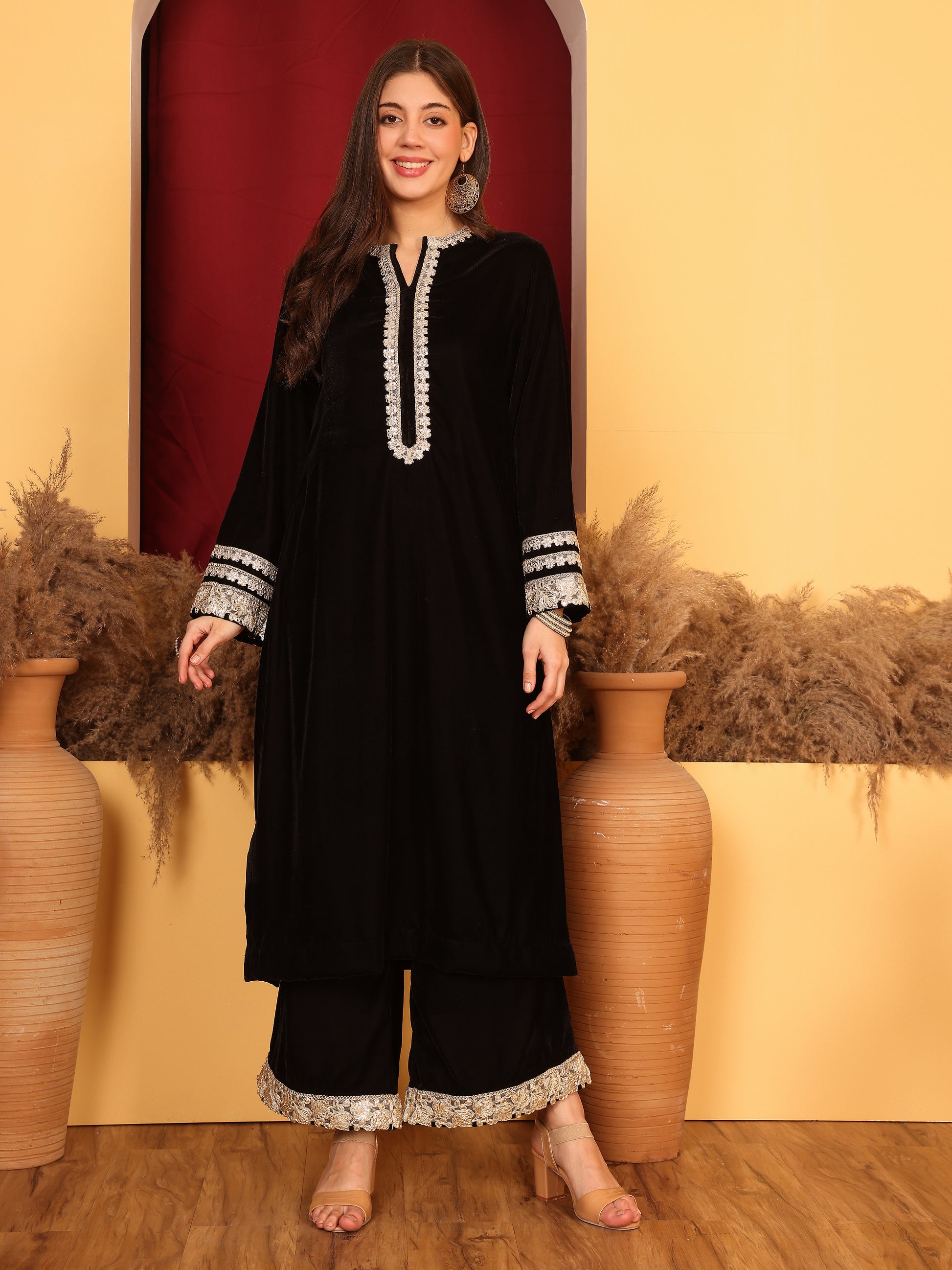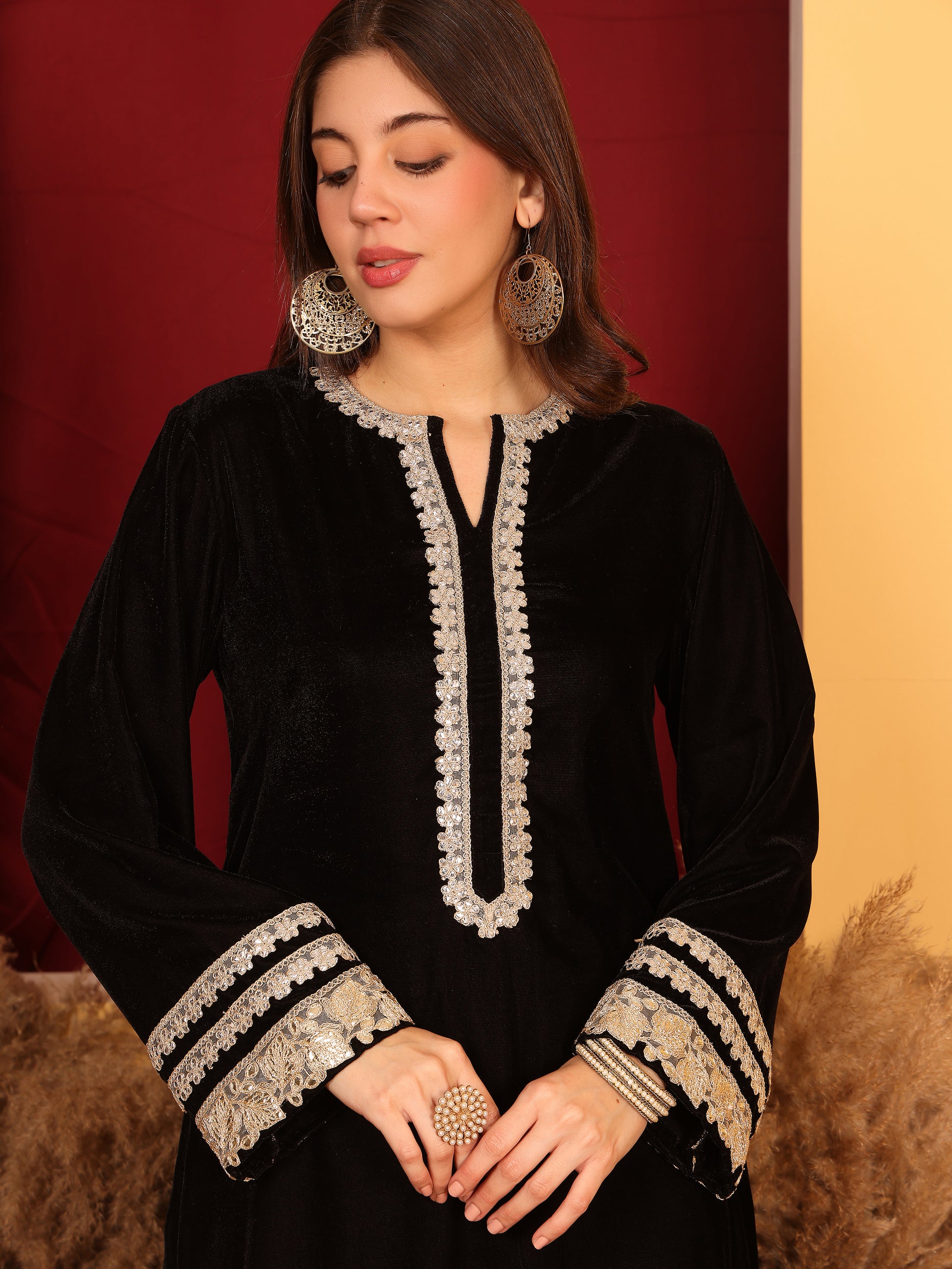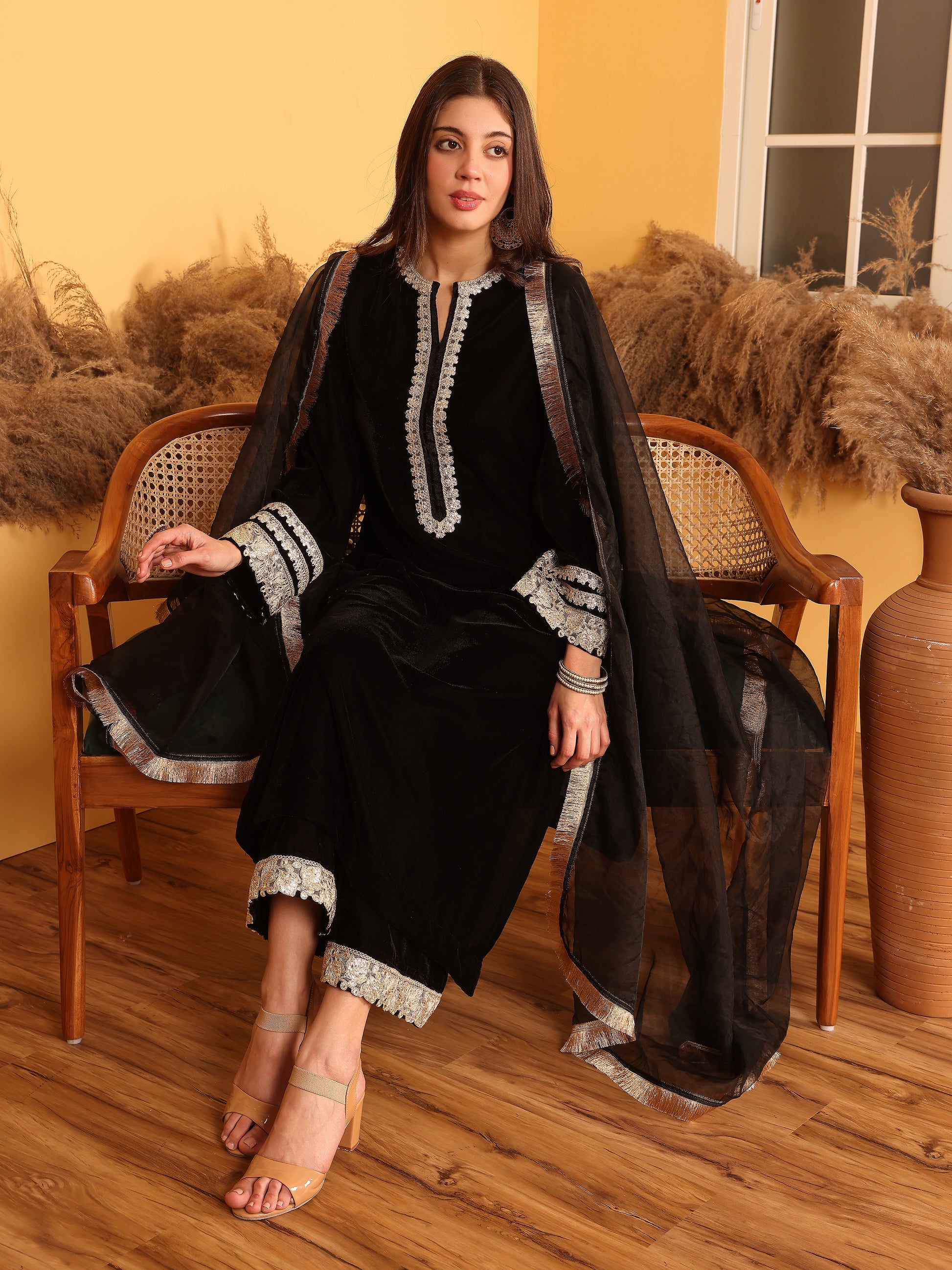 A versatile black velvet suit set having mandarine collar and enhanced with silver lace detailing, this is the star of our winter velvets. Perfect for that classy and chique look.